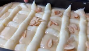 - Montar e Assar: Despeje a massa na forma preparada. Coloque o creme resfriado em um saco de confeitar e faça tiras sobre a massa crua (o creme afundará levemente durante o cozimento). Asse por aproximadamente 40 minutos ou até que um palito saia limpo.